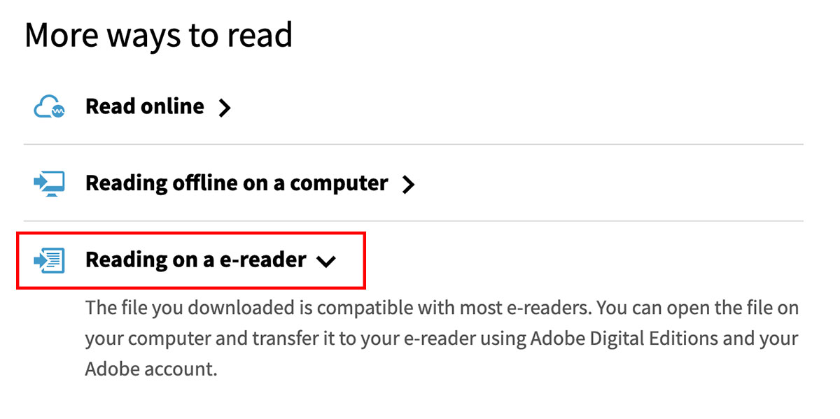 If you prefer to use another application to read an ebook borrowed from your library on your tablet or smartphone, you can do so. You need to download the borrowed ebook file from the web interface and then open it with your e-reading application. An Adobe ID is also required. Follow the steps below for instructions.