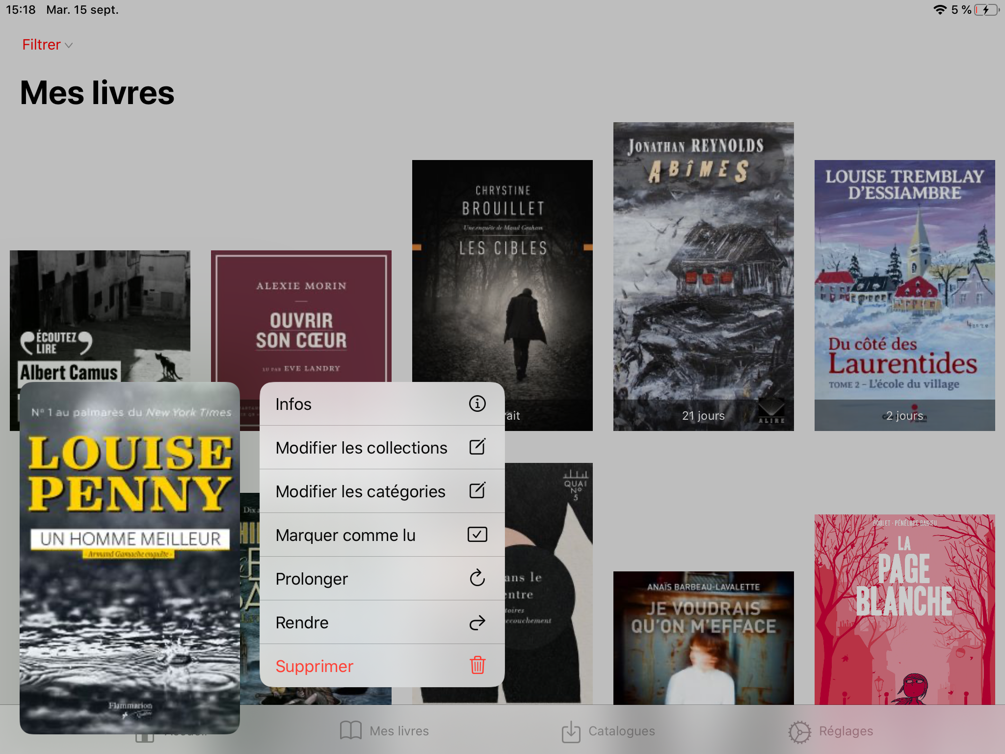 Long-press the cover image of the ebook you want to return until a modal window appears.